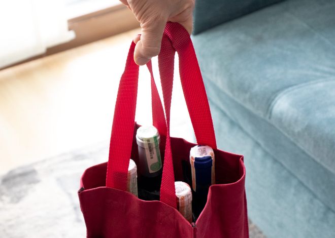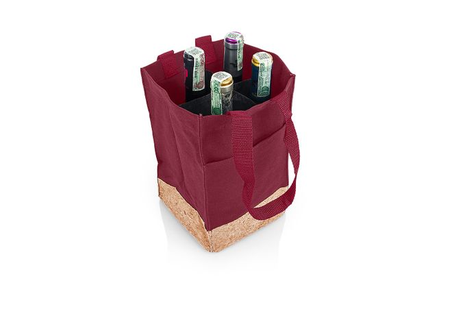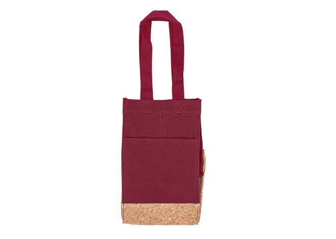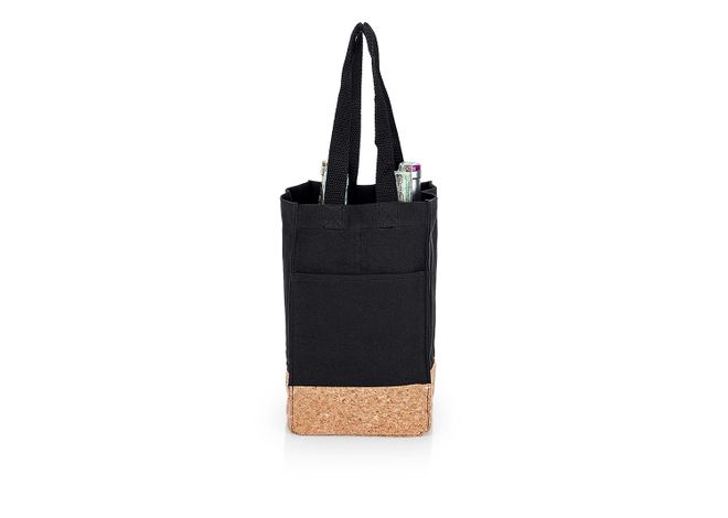 Bolsa canvas y corcho para vinos con doble correa para cargar, separador textil cosido al interior para 4 botellas, base solida y bolsillo exterior.