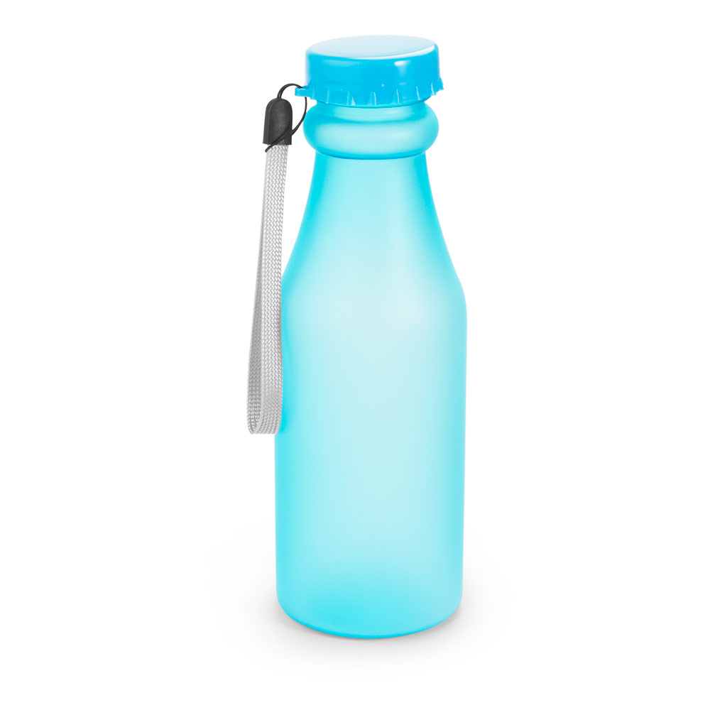 Botella con tapa rosca y cordón que sirve como agarradera. Capacidad 550ml /19,35 Oz.