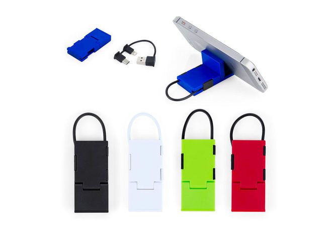 Cable de Carga 3 en 1. Conector Dual: Micro USB para dispositivos Android y Lightning para Iphone en un mismo puerto. Y conector Tipo C. Con soporte para móvil.
