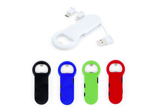 Cable de carga 3 en 1. Conector Dual: Micro USB para dispositivos Android y Lightning para Iphone en un mismo puerto. Y conector Tipo C. Presentado en forma de destapador como uso adicional.