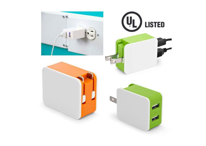 Cargador de pared con 2 puertos USB, entrada 100-240V – 50/60Hz, 0.3 A max. salida 5V-2.1A (total puertos). Cuenta con Certificado de Seguridad UL (E361273).