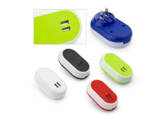 Cargador de pared con doble puerto USB y luz nocturna. Salida 5V-2.1A