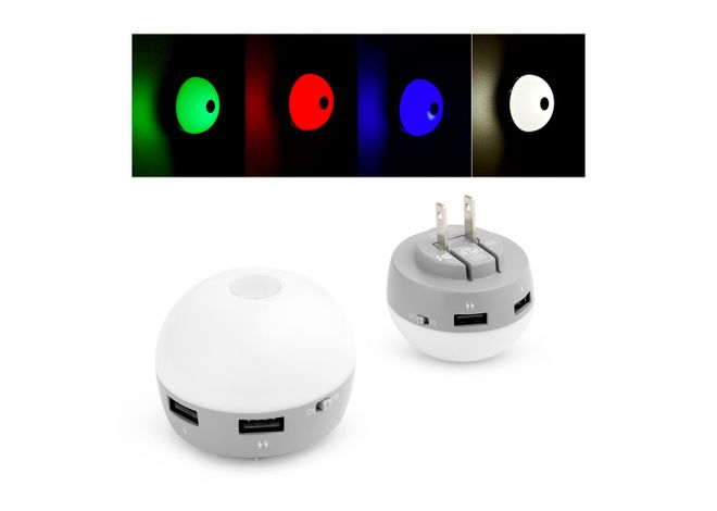 Cargador de pared con doble puerto USB y luz nocturna. Entrada: 100-240V Rendimiento: 2,1A. Doble salida. Tiene interruptor para enceder o apagar la luz LED.