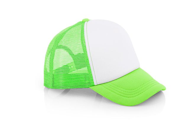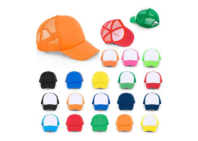 Gorra de 5 paneles con frente fusionado y parte posterior en malla, visera indeformable 4 costuras, botón forrado, tafilete textil y cierre plástico.