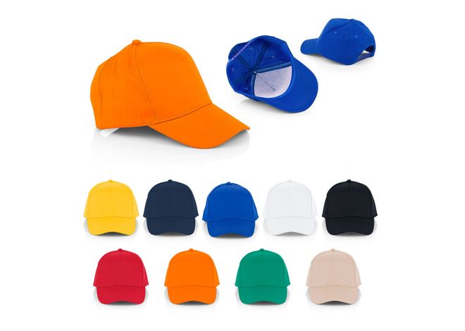 Gorra de 5 paneles con frente fusionado, visera indeformable 4 costuras, botón forrado, 4 ojetes bordados, tafilete textil y cierre plástico.