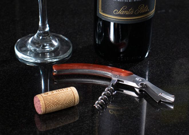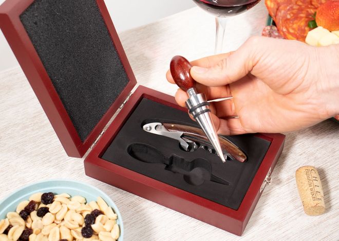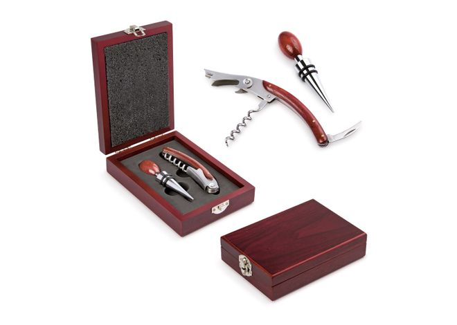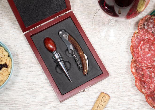 Caja de madera con 2 accesorios con apliques en madera: Tapón y sacacorchos metálico.
