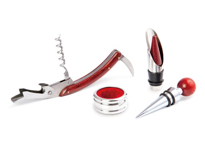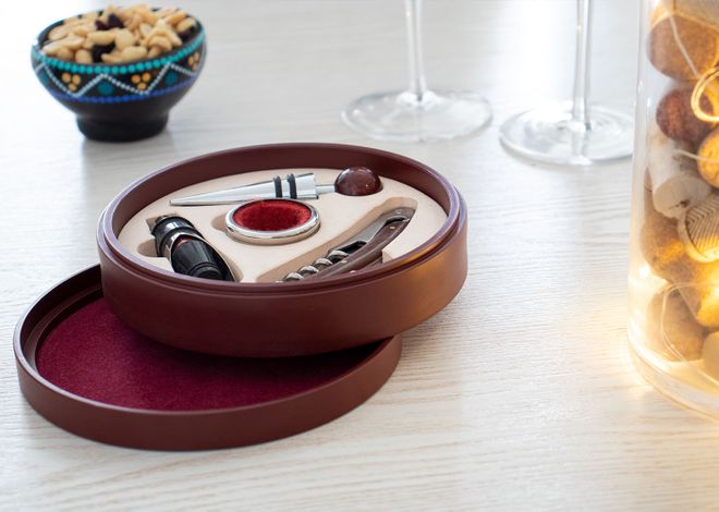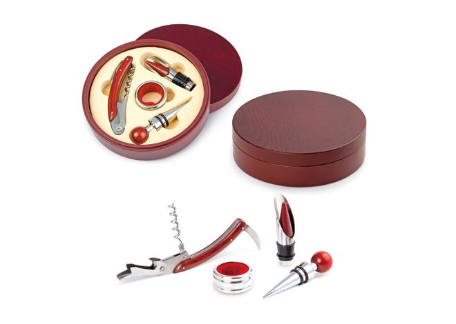 Contiene 4 accesorios con apliques en madera: Tapón para botella, cortagotas, aro antigoteo, sacacorchos de un tiempo. Caja circular de madera con interior beige.