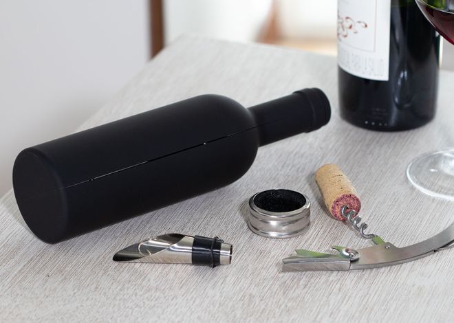 Contiene 3 accesorios de bar: Tapón para botella, aro anti goteo, sacacorchos de 1 tiempo. Caja con diseño de botella y acabado en goma.