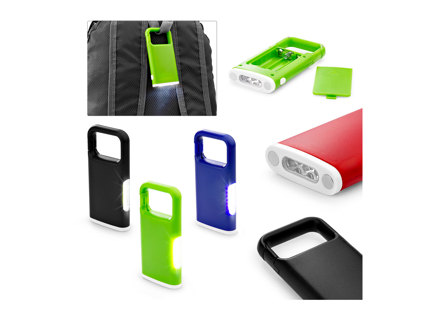 Linterna imantada con Luz COB y gancho carabinero. Funciona con tres baterías AAA no incluidas.