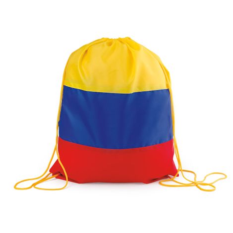 Tricolor Mochila con cordón para ajustar y cargar. Con refuerzo en las esquinas. MATERIAL: Poliéster 210D. MEDIDAS: 34 x 43,5 cm. ÁREA DE IMPRESIÓN APROXIMADA: 23 x 10 cm. MARCA: SE SUGIERE: Screen confección hasta 5 tintas.