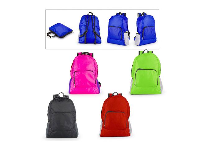 Morral plegable con agarraderas ajustables, bolsillos frontales con cremallera y lateral en malla.