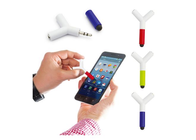 Splitter con doble entrada para cable con plug de 3,5 mm y stylus para dispositivos de pantalla táctil. Con este dispositivo puedes distribuir el audio de tu celular o tablet con dos audífonos diferentes, comparte tu música de forma mas fácil.