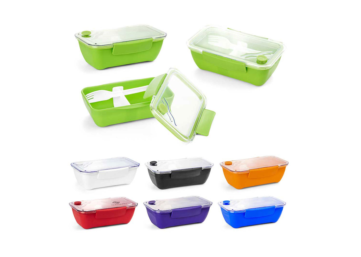 Portacomidas con cierre hermético y separador extraible, incluye tenedor. Apto para microondas.