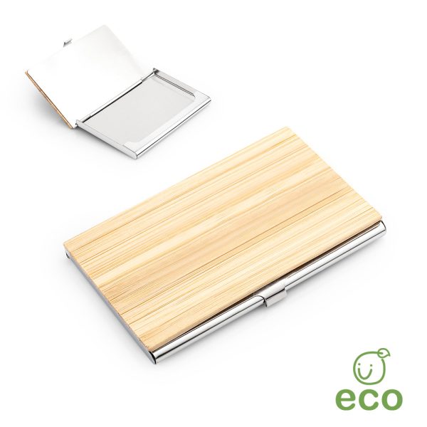 Portatarjeta Metalico con cubierta en Bambú, cierre a presion.